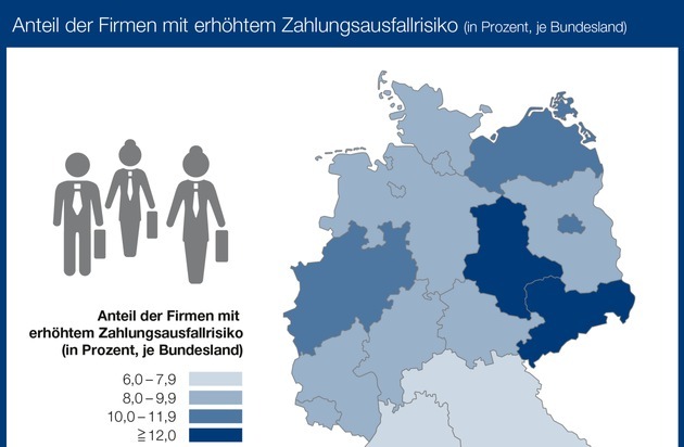 Beim Blick auf die regionale Verteilung der Firmen mit hohem Zahlungsausfall- bzw. Insolvenzrisiko zeigen sich große Unterschiede. In absoluten Zahlen stehen Nordrhein-Westfalen (72.045), Bayern (39.745) und Baden-Württemberg (32.980) an der Spitze der Statistik der Bundesländer mit den meisten finanzschwachen Unternehmen. Bezogen auf die Firmendichte geht die höchste Insolvenzgefahr derzeit von Unternehmen in Sachsen-Anhalt aus. Aktuell sind 12,6 Prozent der Unternehmen dort in einer finanziellen Schieflage und somit von einer drohenden Zahlungsunfähigkeit betroffen. Aber auch in Sachsen (12,2 Prozent), Berlin (10,6 Prozent), Nordrhein-Westfalen (10,2 Prozent), Mecklenburg-Vorpommern (10,1 Prozent), Brandenburg (9,6 Prozent), Thüringen (9,4 Prozent) und Bremen (9,2 Prozent) ist die Insolvenzgefahr der Unternehmen höher als im Bundesdurchschnitt (8,9 Prozent). Prozentual betrachtet geht ein geringeres Risiko von Unternehmen in Bayern aus. Hier gelten nur 6,7 Prozent der Unternehmen bonitätsschwach.