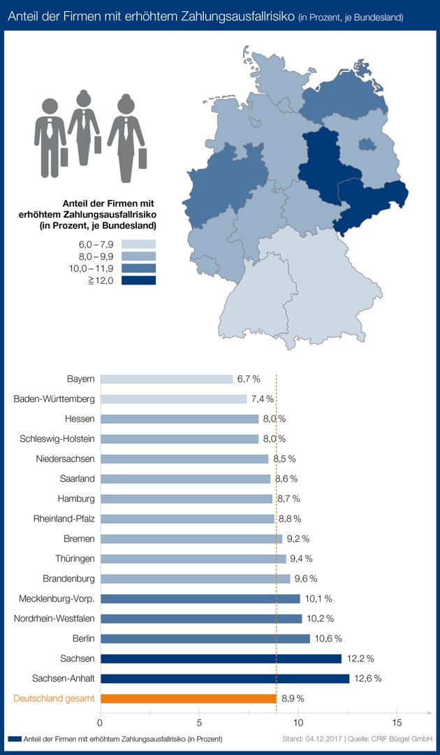 Beim Blick auf die regionale Verteilung der Firmen mit hohem Zahlungsausfall- bzw. Insolvenzrisiko zeigen sich große Unterschiede. In absoluten Zahlen stehen Nordrhein-Westfalen (72.045), Bayern (39.745) und Baden-Württemberg (32.980) an der Spitze der Statistik der Bundesländer mit den meisten finanzschwachen Unternehmen. Bezogen auf die Firmendichte geht die höchste Insolvenzgefahr derzeit von Unternehmen in Sachsen-Anhalt aus. Aktuell sind 12,6 Prozent der Unternehmen dort in einer finanziellen Schieflage und somit von einer drohenden Zahlungsunfähigkeit betroffen. Aber auch in Sachsen (12,2 Prozent), Berlin (10,6 Prozent), Nordrhein-Westfalen (10,2 Prozent), Mecklenburg-Vorpommern (10,1 Prozent), Brandenburg (9,6 Prozent), Thüringen (9,4 Prozent) und Bremen (9,2 Prozent) ist die Insolvenzgefahr der Unternehmen höher als im Bundesdurchschnitt (8,9 Prozent). Prozentual betrachtet geht ein geringeres Risiko von Unternehmen in Bayern aus. Hier gelten nur 6,7 Prozent der Unternehmen bonitätsschwach.