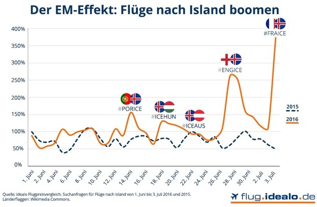 Die isländische Nationalmannschaft kam aus dem Nichts und eroberte mit einem lauten "HUH!" die Herzen der EM-Zuschauer. Selten sorgte ein Team für so viel Begeisterung und gute Stimmung bei einem Fußball-Turnier. Davon profitiert nun auch die Toursimusbranche wie die Daten vom Reise-Preisvergleich bei idealo ergeben haben.