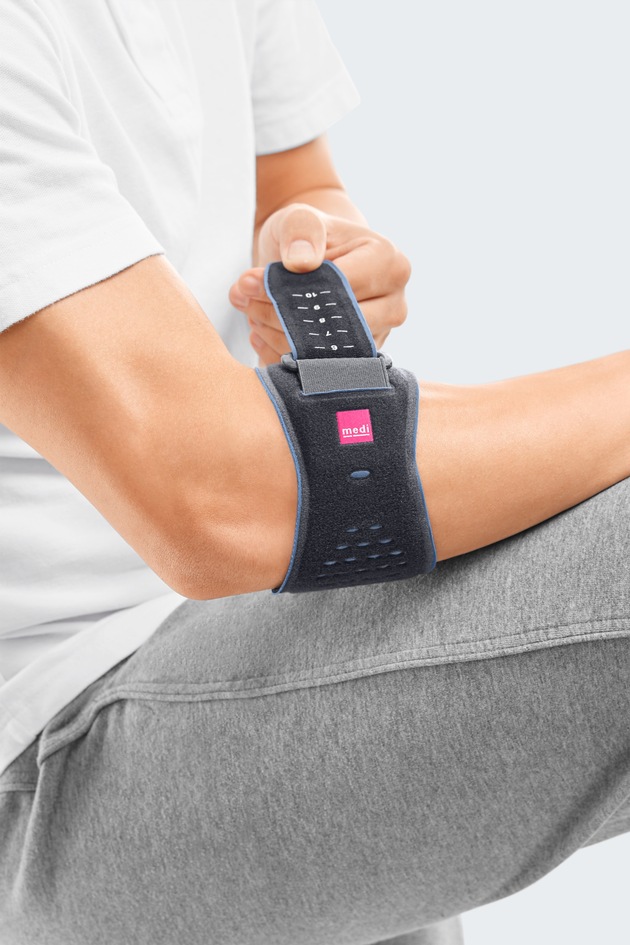 Die medi Epibrace ist beim Tennis- und Golferellenbogen, Mausarm sowie für den linken und rechten Arm einsetzbar. Sie besitzt jetzt eine flexible Pelotte mit 3D-Profil, die therapiegerecht positioniert werden kann. Zusammen mit dem Gurtband, mit dem der Druck auf die schmerzenden Sehnenansätze individuell dosiert werden kann, sorgt sie für eine effektive Entlastung. Dank der Nummerierung am Gurtband wird die gewünschte Druckintensität individuell eingestellt. Die medi Epibrace fördert die Durchblutung und unterstützt den Heilungsprozess.