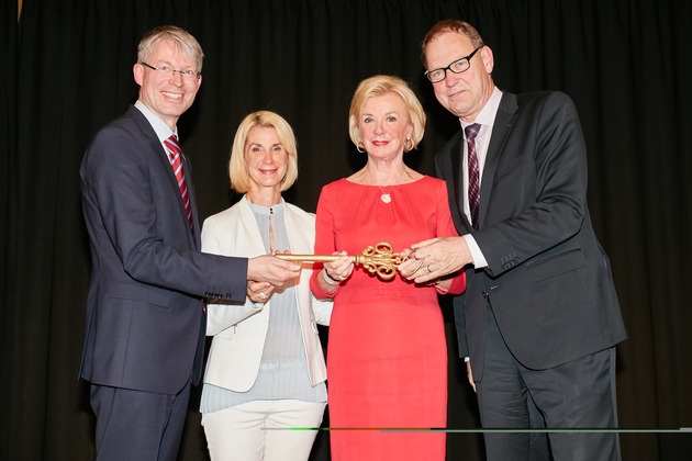 Aart De Geus übergab als Vorstandsvorsitzender der Bertelsmann Stiftung den symbolischen Schlüssel für das Haus an Liz Mohn. Diese bedankte sich sehr herzlich bei allen Beteiligten. "Es ist ein Moment, auf den ich mich lange gefreut habe, weil es mir eine besondere Herzensangelegenheit ist", so die Präsidentin. Sie wolle die Arbeit der Stiftung langfristig sichern und in der Heimatstadt sichtbar machen. "Ich möchte ein Haus, mit dem die Schlaganfall-Hilfe noch mehr für die Menschen in Gütersloh und Umgebung da sein kann."