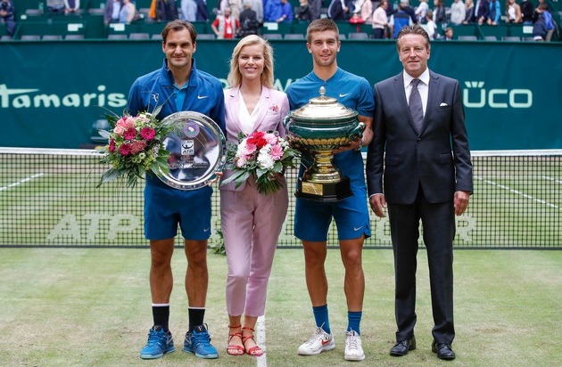 "Spiel, Satz und Sieg" hieß es wieder bei Deutschlands bedeutendstem ATP 500-ter Rasenevent, das nach dem Namen des internationalen Modekonzerns "GERRY WEBER OPEN" heißt. Vor einer enthusiastischen Zuschauerkulisse im vollbesetzten Stadion zeigten die Finalisten Roger Federer und Borna Coric ein spannendes Endspiel. Der Sieger Borna Coric nahm von Eva Herzigova, Testimonial der Marke GERRY WEBER, dem nordrhein-westfälischen Ministerpräsident und Schirmherr des Turniers Armin Laschet und Ralf Weber, Vorstandsvorsitzender der GERRY WEBER International AG und Turnierdirektor der GERRY WEBER OPEN den mit 24-karätigen Blattgold und Porzellan verzierten Siegerpokal entgegen.