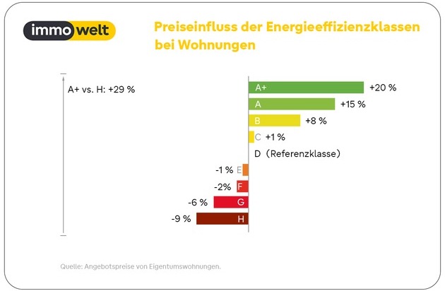 - Wohnungen mit Effizienzklasse A+ kosten rund 20 Prozent mehr als vergleichbare Angebote mit mittlerer Klasse D