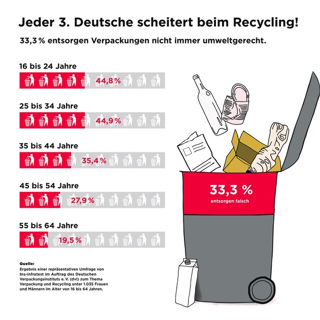 Wie die Umfrage des dvi zeigt, scheitert mit über 33,3 % mehr als jeder dritte Deutsche immer wieder beim Recycling. Auch wenn die Gründe unterschiedlich sind, aus Sicht des dvi muss es "das Ziel sein, die Quote derjenigen, die alle gebrauchten Verpackungen richtig entsorgen, auf über 80 % zu bringen. Sonst gehen zu viele wertvolle Verpackungen mit dem Restmüll in die Verbrennung, werden zum Störfaktor für die Materialströme des Recycling oder belasten die Umwelt", so Reiner. Bedenklich sind für den dvi-Vorstandsvorsitzenden vor allem die Ergebnisse bei den 16 - 34-Jährigen, wo die Quote bei nur 55,2 % liegt. Hier offenbaren sich scheinbar massive Grundlagendefizite. "Ein gutes Viertel der Jahrgänge ab 1983 hat große Informations- und Wissensdefizite, wie und wo gebrauchte Verpackungen gesammelt werden. Die Aufklärungsarbeit der 90er-Jahre zur Mülltrennung hat diese Generation offensichtlich nicht mehr erreicht. Hier gibt es dringenden Handlungsbedarf."