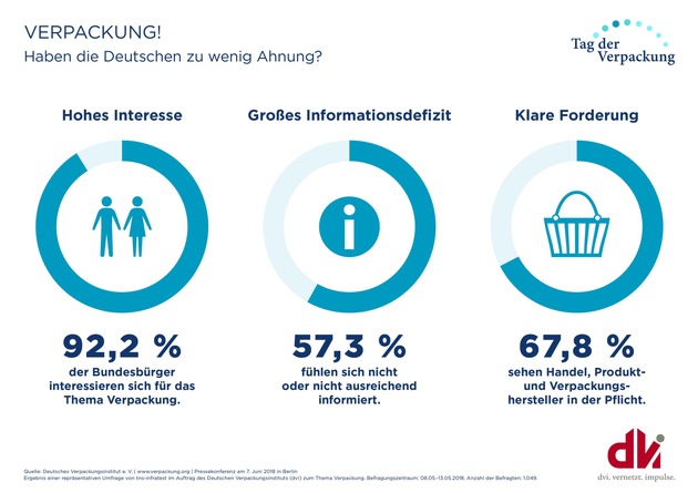 Laut einer repräsentativen Umfrage von tns-infratest im Auftrag des Deutschen Verpackungsinstituts e. V. (dvi) aus Anlass des 4. Tags der Verpackung interessieren sich 92,2 Prozent der Bundesbürger für das Thema Verpackung. Eine absolute Mehrheit von 57,3 Prozent fühlt sich allerdings persönlich gar nicht oder nicht ausreichend informiert, um wichtige Aspekte einer Verpackung objektiv beurteilen zu können. Mehr und bessere Informationen erwartet diese Gruppe insbesondere vom Handel (23,5 Prozent), von Verpackungsherstellern (22,6 Prozent) und Produktherstellern (21,7 Prozent).