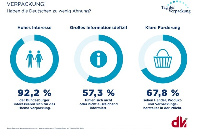 Laut einer repräsentativen Umfrage von tns-infratest im Auftrag des Deutschen Verpackungsinstituts e. V. (dvi) aus Anlass des 4. Tags der Verpackung interessieren sich 92,2 Prozent der Bundesbürger für das Thema Verpackung. Eine absolute Mehrheit von 57,3 Prozent fühlt sich allerdings persönlich gar nicht oder nicht ausreichend informiert, um wichtige Aspekte einer Verpackung objektiv beurteilen zu können. Mehr und bessere Informationen erwartet diese Gruppe insbesondere vom Handel (23,5 Prozent), von Verpackungsherstellern (22,6 Prozent) und Produktherstellern (21,7 Prozent).