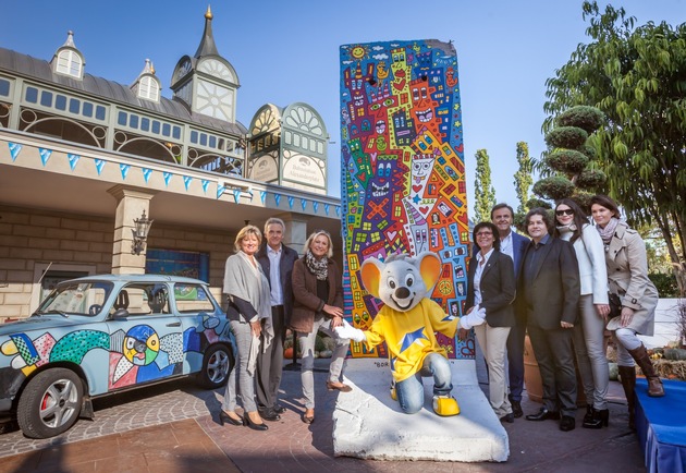 Kunstunikat meets Deutschlands größten Freizeitpark - ein Originalstück der Berliner Mauer, das der New Yorker Pop-Art Künstler James Rizzi gestaltet hat, präsentiert der Europa-Park seinen Besuchern seit dem 1. Oktober 2015. Das fast vier Meter hohe und 3,8 Tonnen schwere Element ist im Eingangsbereich des Europa-Park zu bestaunen. Am Anfang der Deutschen Allee ist es heute feierlich von Europa-Park Inhaber Roland Mack und Medienunternehmerin Sabine Christiansen enthüllt worden. "Anlässlich 25 Jahre deutsche Wiedervereinigung wollen wir mit diesem einzigartigen Kunstwerk auf die Bedeutung des Falls der Mauer für uns alle aufmerksam machen", sagte Roland Mack. Das Mauerstück weist auch auf die große James Rizzi-Ausstellung im Europa-Park hin, die während der Winteröffnung zu sehen sein wird.