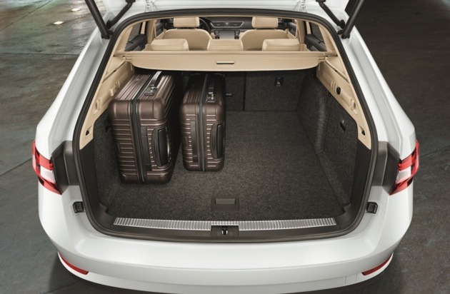 Der neue SKODA Superb Combi verfügt über das größte Gepäckabteil der automobilen Mittelklasse. Obwohl der neue Superb Combi nur um 23 mm länger ist als sein Vorgänger, fasst der Kofferraum bei aufgestellten Sitzen 27 Liter mehr als bisher. Bei umgeklappter Rücksitzbank erreicht das Ladevolumen sogar fast zwei Kubikmeter: 1.950 Liter Ladevolumen sind mit Abstand Best-in-Class und 85 Liter mehr als beim Vorgängermodell. Auch das Verstauen langer Gegenstände ist problemlos möglich. Die Beifahrersitzlehne kann bei Bedarf einfach umgeklappt werden. Dann passen bis zu 3,10 Meter lange Gegenstände in den neuen Superb Combi.
