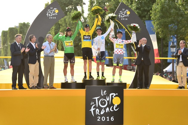 ÖffentlichkeitNach insgesamt 21 kräftezehrenden Etappen feierte Christopher Froome am Sonntag den Gewinn der diesjährigen Tour de France. Vor Millionen Zuschauern reckte der 31-jährige Radprofi nach der Zielankunft auf der Champs-Élysées stolz die von SKODA entworfene Siegertrophäe aus tschechischem Kristallglas in den Pariser Himmel. Die grüne Glasskulptur für den Führenden in der Punktewertung der diesjährigen Tour überreichte der SKODA Vorstandsvorsitzende Bernhard Maier an Peter Sagan. Die Pokale für den erfolgreichsten Jungprofi sowie den besten Bergfahrer des schwierigsten Radrennens der Welt gingen an Adam Yates und Rafal Majka. Die tschechische Traditionsmarke unterstützte die Tour de France in diesem Jahr bereits zum 13. Mal als offizieller Sponsor und Fahrzeugpartner. Im Rahmen der letzten Etappe setzte SKODA mit der Publikumspremiere des neuen SKODA KODIAQ ein weiteres Highlight - das große SUV der Marke fuhr mit einer rot-grau-schwarzen ,Tarnkappe' im Tour-Tross und drehte insgesamt sechs Ehrenrunden auf der Champs-Élysées.