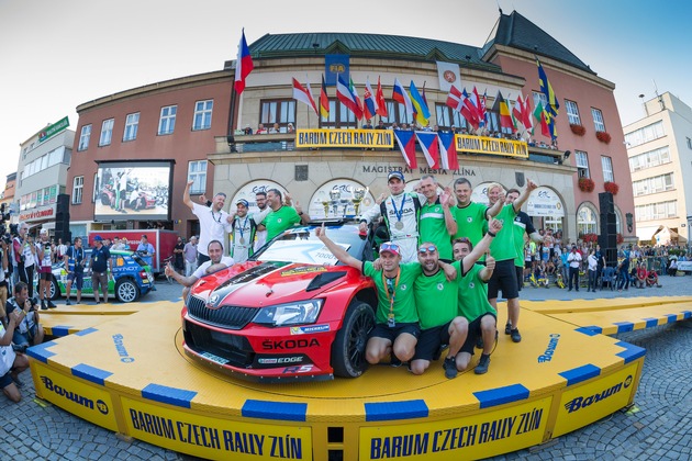 gesamten Teams"Das SKODA Werksduo Jan Kopecky/Pavel Dresler (CZ/CZ) hat die Barum Czech Rally Zlin gewonnen und damit vorzeitig den Titel in der Tschechischen Rallye-Meisterschaft (MCR) verteidigt. Kopecky gewann nach 2004, 2012 und 2015 zum vierten Mal das nationale Championat. Der Routinier blieb in seinem SKODA FABIA R5 in spektakulärer rot-schwarzer Sonderlackierung auch im fünften Saisonlauf der MCR ungeschlagen und setzte sich dabei gegen die europäische Elite durch. Das SKODA Erfolgsteam Kopecky/Dresler lieferte sich über die drei Rallye-Tage ein dramatisches Duell mit Alexey Lukyanuk/Alexey Arnautov (RUS/RUS), die nach einem Unfall auf der letzten Wertungsprüfung alle Chancen einbüßten.