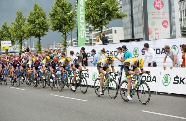 Für Fans, die nicht selbst in die Pedale treten, hat SKODA eine unterhaltsame Roadshow im architektonisch beeindruckenden Rheinauhafen organisiert. Hier präsentiert die tschechische Traditionsmarke zum Beispiel ihre neuesten Modelle. Highlight ist eine rote SUPERB-Limousine im schicken 'Tour de France'-Branding.