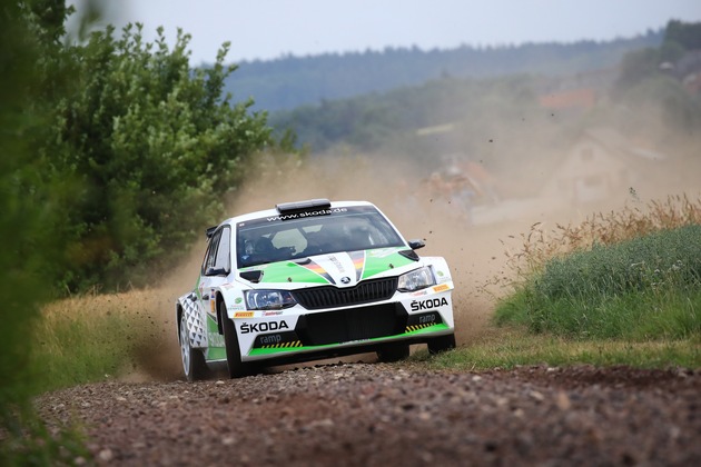 Vom Gejagten zum Jäger: Fabian Kreim und Frank Christian gingen am Samstagmorgen als Zweite auf die Strecke, untermauerten ihren Anspruch auf den Sieg aber sofort mit einigen Bestzeiten und erfuhren sich so auf den schnellen Asphaltpisten mit den gefühlt tausend Abzweigungen schrittweise einen deutlichen Vorsprung. Schrecksekunde dann jedoch in der drittletzten Wertungsprüfung ,Schnathorst 1': Im Ausgang einer Schikane touchierte der SKODA Champion einen im Gras versteckten Stein und beschädigte sich dabei die vordere rechte Radaufhängung. Aber der robuste FABIA R5 hielt und Kreim/Christian gelang ein tolles Happy End: Das Team von SKODA AUTO Deutschland war nach 133 Kilometern und 15 Wertungsprüfungen im Ziel 9,3 Sekunden schneller als ihre Dauerrivalen Rene Mandel/Dennis Zenz (D/D), nach der Sachsen-Rallye der zweite Triumph in Folge. Im Schatten von Sieger Kreim lieferten sich Mandel und SKODA Pilot Dinkel lange Zeit ein packendes Duell um Platz zwei, das Dinkel wegen eines Ausrutschers in der drittletzten Wertungsprüfung nur knapp verlor.