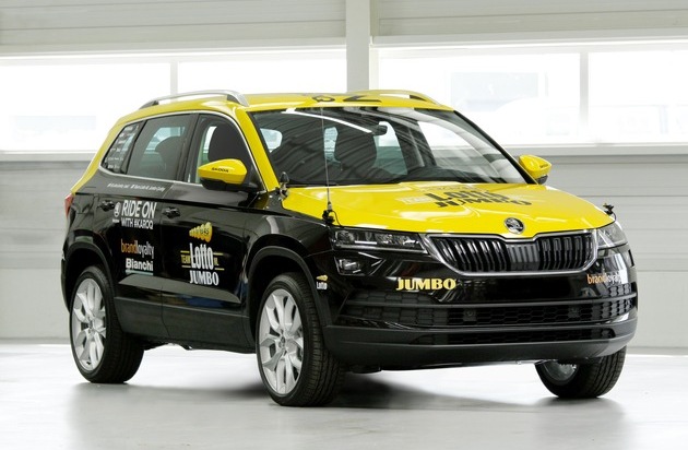 Die SKODA KAROQ-Modelle sind individuell in den Farben der Teams gestaltet: Die Mannschaft von Team Dimension Data wird von einem SKODA KAROQ in Schwarz, Weiß und Grün begleitet, das Kompakt-SUV von Team Lotto NL-Jumbo ist in Gelb und Schwarz gestaltet, das Team von Lotto Soudal begleitet ein rot-weißer KAROQ. Auf den Dächern aller Kompakt-SUVs prangt der Schriftzug ,RIDE ON WITH #KAROQ'.