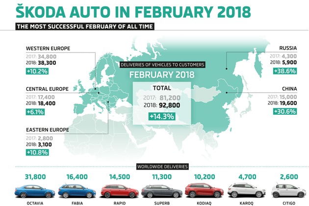- SKODA AUTO liefert im Februar 92.800 Fahrzeuge an Kunden aus