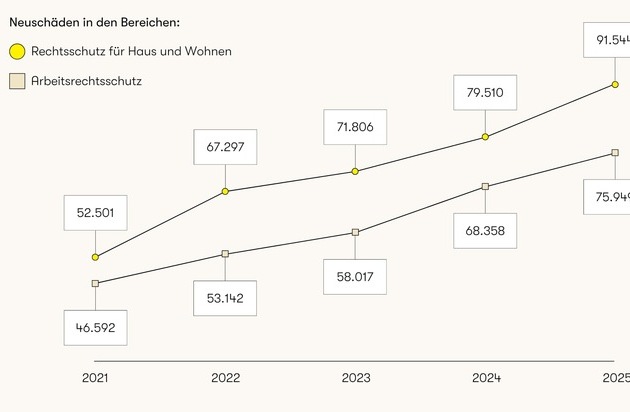 Die Entwicklung der ARAG Rechtsschutzfälle zeigt, wie stark sich gesellschaftliche Veränderungen im Alltag der Menschen widerspiegeln. Seit COVID ist ein eindeutiger Trend erkennbar: Der Unterstützungsbedarf der Verbraucher rund um rechtliche Fragestellungen wächst enorm, die Rechtsschutzfälle legen jedes Jahr deutlich zu. So stiegen in den vergangenen fünf Jahren vor allem Auseinandersetzungen in den Bereichen Arbeit um 63 Prozent und Miete/Wohnen um 74 Prozent massiv an. Allein in 2025 lag das Plus bei 11,1 Prozent im Arbeitsrecht und bei 15,1 Prozent im Mietrecht. Dass die persönliche Resilienz für Verbraucher rund um rechtliche Fragestellungen immer bedeutsamer wird, unterstreicht die Zahl von mehr als 765.000 Rechtsschutzfällen, in denen die ARAG in 2025 Unterstützung geleistet hat.