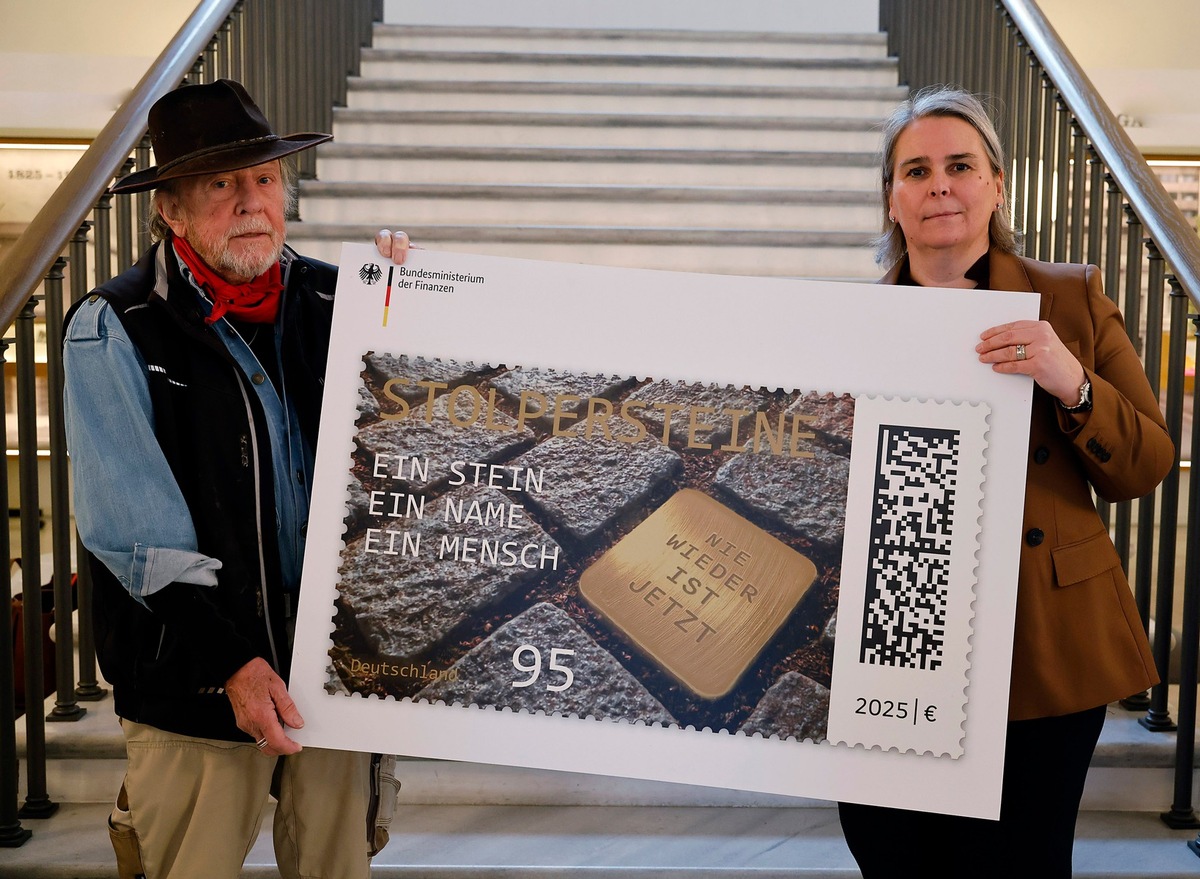 Bonn/Frankfurt, 5. Dezember 2025: Die Deutsche Post hat gemeinsam mit dem Künstler und „Vater“ der Stolpersteine-Initiative, Gunter Demnig, die neue Sonderbriefmarke mit dem Titel „STOLPERSTEINE – EIN STEIN, EIN NAME, EIN MENSCH“ in Frankfurt a.M. vorgestellt. Mit dabei waren auch die stellvertretende ver.di-Vorsitzende Andrea Kocsis, die Unterabteilungsleiterin Laura Krause für das Bundesministerium der Finanzen (BMF) und Vertreter des Gesamtbetriebsrats der Deutschen Post. Die Briefmarke zeigt einen der bekannten golden-glänzenden Erinnerungssteine mit der Gravur „Nie wieder ist jetzt“ und hat den Portowert 95 Cent. Herausgeber ist das BMF, entworfen hat sie Jennifer Dengler, Briefmarken-Designerin der Deutschen Post. Die Marke ist seit dem 4. Dezember in Postfilialen, im Online-Shop oder telefonisch beim Bestellservice der Deutschen Post erhältlich.