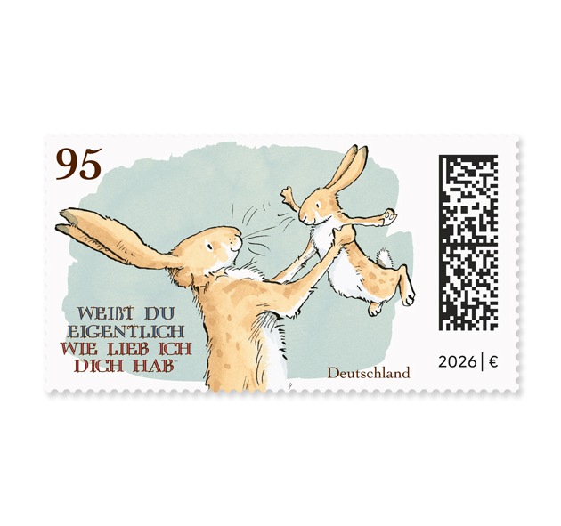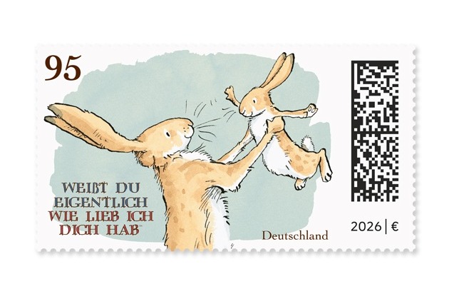 Bonn, 3. Februar 2026: „Weißt du eigentlich, wie lieb ich dich hab?“ ist ein Kinderbuchklassiker, der jetzt auch zur Marke wird: Die Deutsche Post ehrt den internationalen Bestseller des irischen Autors Sam McBratney mit einer Sonderbriefmarke. Diese hat den Portowert 95 Cent und ist ab dem 5. Februar in einer Auflage von 1,3 Millionen Stück in Postfilialen, im Online-Shop oder telefonisch beim Bestellservice der Deutschen Post erhältlich. Offizieller Herausgeber der Briefmarke ist das Bundesministerium der Finanzen, entworfen hat sie Chayenn Gutowski, Briefmarken-Designerin der Deutschen Post.
