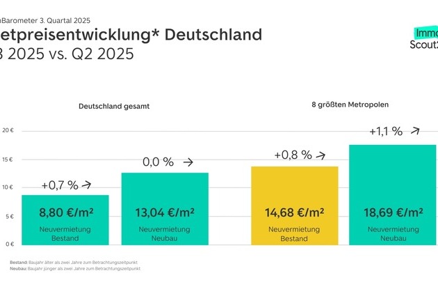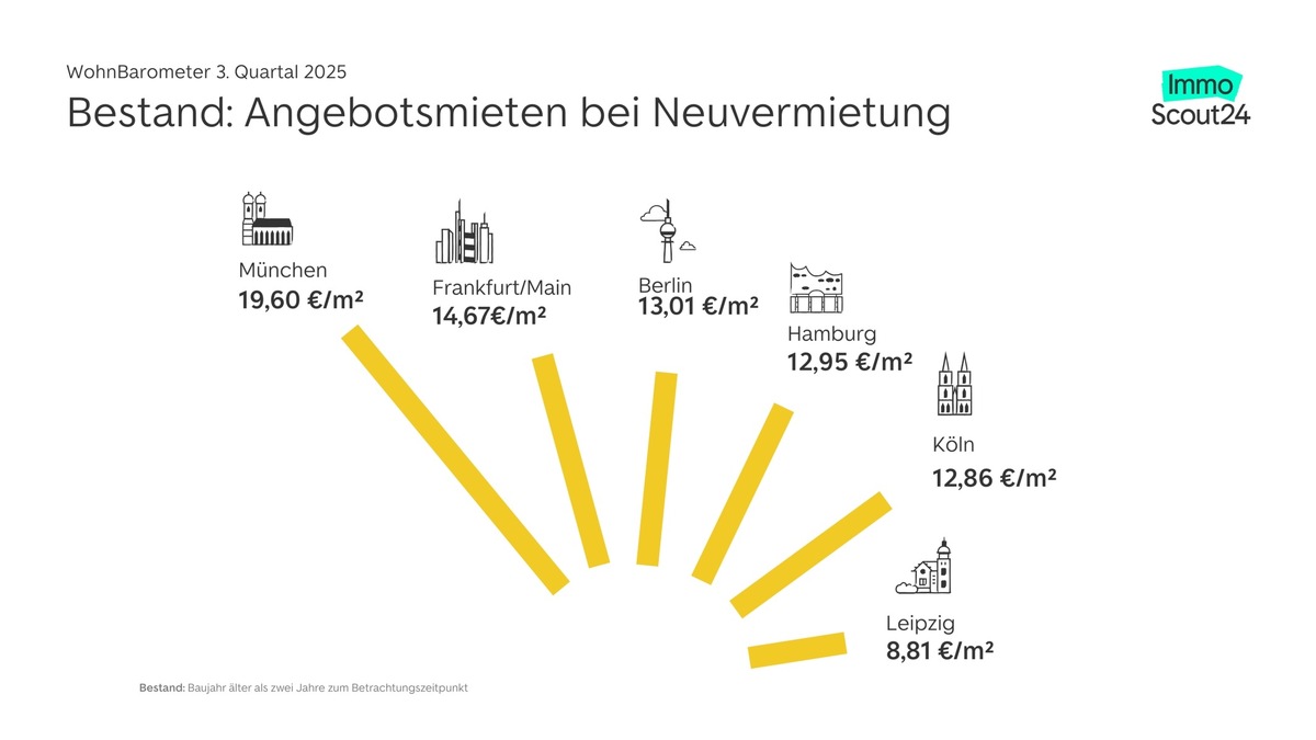 Das ImmoScout24 WohnBarometer ist der Marktreport zur Entwicklung des Immobilienmarkts. Herausgeber ist ImmoScout24: Deutschlands führende Online-Plattform für Wohnimmobilien. Das ImmoScout24 WohnBarometer gibt die Preisentwicklung in realen Angebotspreisen wieder. Die Datenbasis umfasst über 8,5 Millionen Inserate der letzten fünf Jahre auf ImmoScout24. Dabei werden alle Mietwohnungsinserate analysiert. Die Werte werden für Referenzobjekte für den jeweils betrachteten Immobilientyp durch einen Algorithmus aus dem Bereich des maschinellen Lernens ermittelt. Das Referenzobjekt für Mietwohnungen ist eine Zwei-Zimmer-Wohnung mit 70 Quadratmetern. Die Kategorie Neubau enthält alle Angebote mit einem Baualter von maximal zwei Jahren zum jeweiligen Bestimmungszeitpunkt.