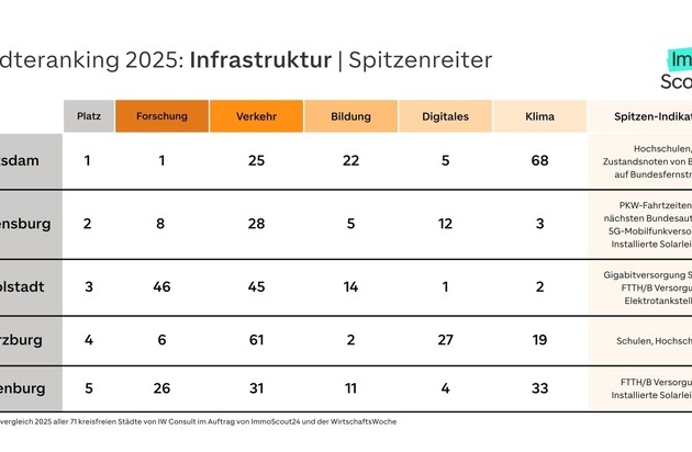 Die 71 größten Städte Deutschlands werden im Städteranking 2025 auf Wirtschaftsniveau, Dynamik und Lebensqualität untersucht. Der erstmalig berechnete Infrastrukturindex misst, wie die Städte in den Bereichen Forschung und Bildung, Verkehr und digitale Netzwerke sowie Klimaresilienz aufgestellt sind. An der Spitze steht Potsdam. Vor dem Hintergrund des 500 Milliarden Euro starken Sondervermögens Infrastruktur und Klimaneutralität (SVIK) des Bundes soll der Infrastrukturindex zeigen, in welchen Städten und Bereichen Nachholbedarf besteht.