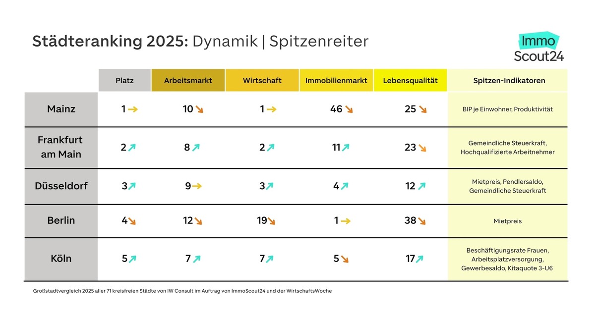Das IW Consult hat im Auftrag von WirtschaftsWoche und ImmoScout24 alle 71 kreisfreien Städte Deutschlands mit mehr als 100.000 Einwohner:innen verglichen. Das Städteranking bewertet die Städte in den Bereichen Arbeitsmarkt, Wirtschaftsstruktur, Immobilienmarkt und Lebensqualität (Niveauranking) sowie deren Entwicklung der letzten fünf Jahre (Dynamikranking).