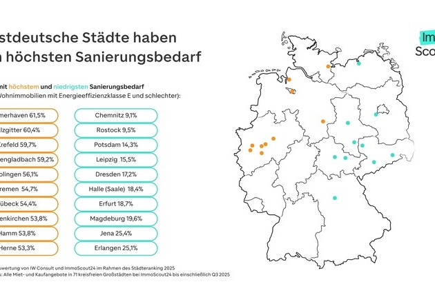 Viele Städte mit hohem Sanierungsbedarf liegen in Nordrhein-Westfalen und Niedersachsen. An der Spitze des Sanierungsbedarfs steht Bremerhaven mit 61,5 Prozent aller Immobilienangebote in den Energieeffizienzklassen E und schlechter. Knapp dahinter folgen Salzgitter mit 60,4 Prozent und Krefeld mit 59,7 Prozent. Weitere Städte mit hohem Sanierungsbedarf sind Mönchengladbach (59,2 Prozent), Solingen (56,1 Prozent), Bremen (54,7 Prozent), Lübeck (54,4 Prozent), Gelsenkirchen (53,8 Prozent), Hamm (53,8 Prozent) und Herne (53,3 Prozent). Auffällig ist die geografische Konzentration.
