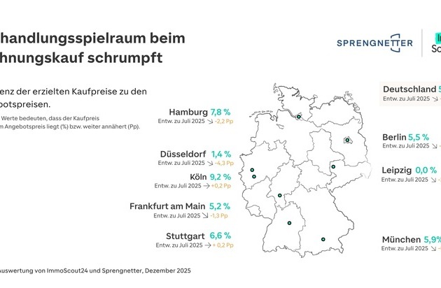 Beim Kauf von Eigentumswohnungen nähern sich Angebotspreise und tatsächlich erzielte Transaktionspreise weiter an – das zeigt eine aktuelle Auswertung von ImmoScout24 und Sprengnetter. Im Dezember 2025 lag der Verhandlungsspielraum bundesweit bei 5,8 Prozent. Damit setzt sich der Trend aus dem vergangenen Sommer fort: Die Preisvorstellungen von Verkäufer:innen und Käufer:innen nähern sich wieder an.