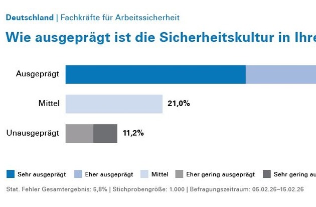 Grund genug, den bisherigen Fokus des Arbeitsschutzes zu überdenken. Dr. Ludwig Brands, Sicherheitsexperte bei TÜV Rheinland: "Die Ergebnisse zeigen, dass Unternehmen bei der Arbeitssicherheit nicht nur über Technik und Prozesse sprechen sollten. Entscheidend ist, ob Sicherheitsregeln im Alltag gelebt werden, ob Führungskräfte Orientierung geben und ob psychische Belastungen systematisch angegangen und als Teil der Arbeitssicherheit ernst genommen werden. Die größten Chancen liegen damit weniger in technischen Fragen als vielmehr im Verhalten und im Aufbau einer starken Sicherheitskultur: Eine wesentliche Rolle spielt eine Unternehmenskultur, in der Arbeitssicherheit nicht nur als bloßes Befolgen von Vorschriften verstanden wird, sondern als gelebte Haltung und Selbstverständnis."