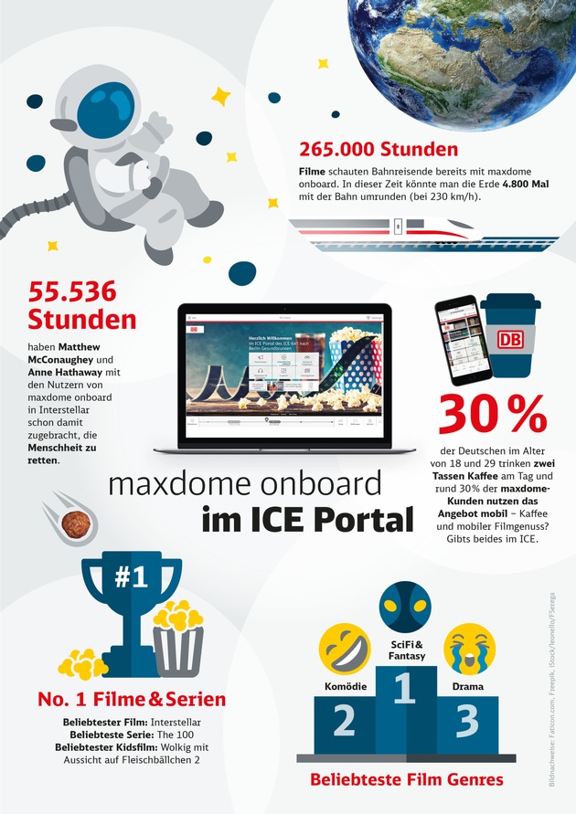 Zugegeben: Astronauten, Superhelden und Zwerge fahren eher selten Zug. Doch seit April 2017 sind die ungewöhnlichen Passagiere eine sehr beliebte Reisebegleitung der ICE-Kunden. Da startete das kostenlose Unterhaltungsangebot maxdome onboard von der Deutschen Bahn. Seitdem genossen die ICE-Fahrgäste schon über 265.000 Stunden Filme und Serien. 55.536 Stunden und damit rund 20 Prozent der gesamten Nutzungsdauer haben die Reisenden dabei mit dem Blockbuster "Interstellar" verbracht - der meistgesehene Film an Bord. Kein Wunder, denn Science Fiction & Fantasy sind die beliebtesten Genres der maxdome onboard Nutzer, gefolgt von Komödien und Dramen. Mit ihrem Filmgeschmack sind die Bahngäste nicht allein: Laut Statista sehen sich 15,2 Prozent der deutschsprachigen TV-Zuschauer sehr gern Science-Fiction oder Fantasy an. Die meistgesehene Serie an Bord ist übrigens "The 100" und der populärste Kinderfilm "Wolkig mit Aussicht auf Fleischbällchen 2".