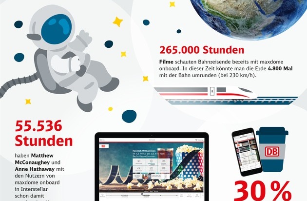 Zugegeben: Astronauten, Superhelden und Zwerge fahren eher selten Zug. Doch seit April 2017 sind die ungewöhnlichen Passagiere eine sehr beliebte Reisebegleitung der ICE-Kunden. Da startete das kostenlose Unterhaltungsangebot maxdome onboard von der Deutschen Bahn. Seitdem genossen die ICE-Fahrgäste schon über 265.000 Stunden Filme und Serien. 55.536 Stunden und damit rund 20 Prozent der gesamten Nutzungsdauer haben die Reisenden dabei mit dem Blockbuster "Interstellar" verbracht - der meistgesehene Film an Bord. Kein Wunder, denn Science Fiction & Fantasy sind die beliebtesten Genres der maxdome onboard Nutzer, gefolgt von Komödien und Dramen. Mit ihrem Filmgeschmack sind die Bahngäste nicht allein: Laut Statista sehen sich 15,2 Prozent der deutschsprachigen TV-Zuschauer sehr gern Science-Fiction oder Fantasy an. Die meistgesehene Serie an Bord ist übrigens "The 100" und der populärste Kinderfilm "Wolkig mit Aussicht auf Fleischbällchen 2".