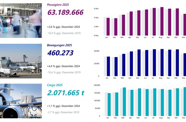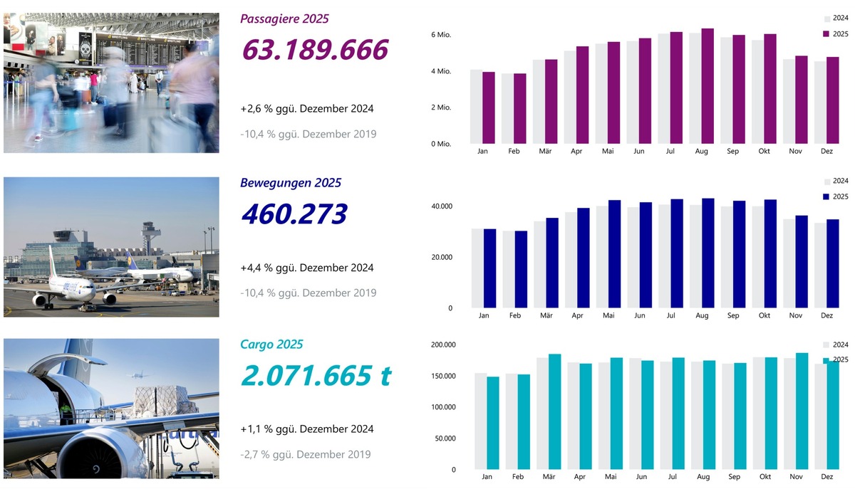 Flughafen Frankfurt begrüßte 2025 rund 63,2 Millionen Fluggäste / Zuwachs von 2,6 Prozent gegenüber Vorjahr / Im Konzern stieg Passagieraufkommen um 5,3 Prozent auf 183,7 Millionen Passagiere