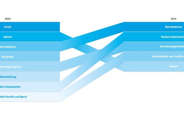 2004 Inhalt der Tätigkeit (68%) Gehalt (64%) Betriebsklima (53%) Karrieremöglichkeiten (38%) Flexible Arbeitszeiten (28%) Vereinbarkeit Familie und Beruf (27%)
