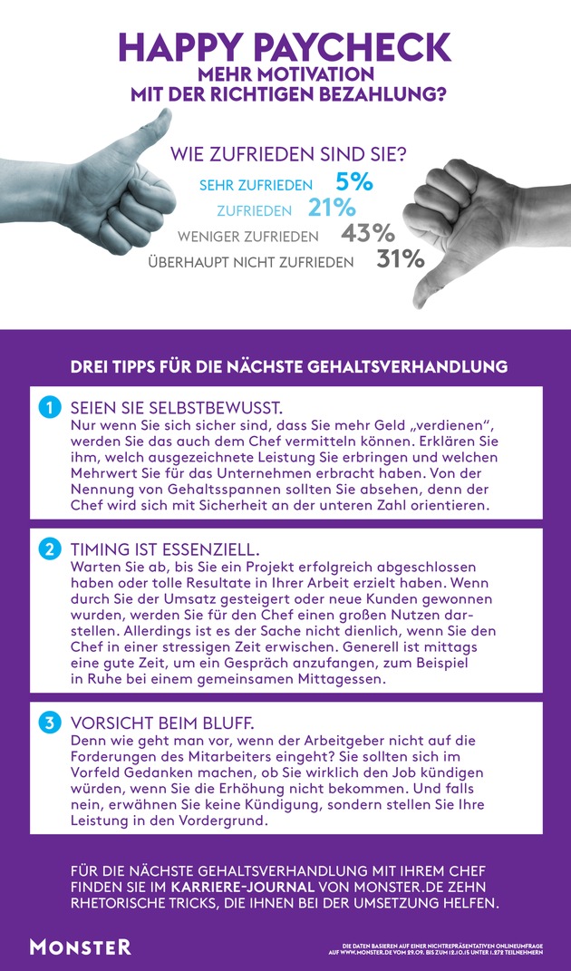 - Monster-Umfrage: 74 Prozent der Teilnehmer sind mit ihrer Bezahlung unzufrieden - Studienreihe Bewerbungspraxis 2015 zeigt auch: Die Mehrheit der Befragten nimmt Angebote von Unternehmen nur an, wenn sie die Gehaltsvorstellungen erfüllen