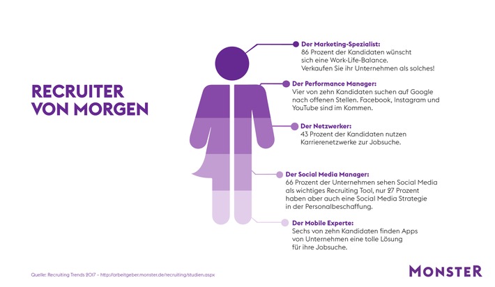 richtigen ExpertiseFür erfolgreiches Recruiting gilt: "Die Zukunft beginnt heute". Was das für Unternehmen und ihre Recruiter heißt, zeigt die aktuelle Studienreihe* des Centre of Human Resources Information Systems (CHRIS) der Universität Bamberg, die in Zusammenarbeit mit dem Karriereportal Monster entstand. Zum inzwischen 15. Mal in Folge beleuchtet sie die Situation von Unternehmen und Jobsuchenden in Deutschland. Wer die besten Köpfe gewinnen möchte, sollte offen für neue Wege sein und über diverse Kompetenzen verfügen. "Nur Unternehmen, die nicht nur einen Blick in die Glaskugel werfen, sondern die neuen Möglichkeiten auch umsetzen, können sich effizient und erfolgreich gegen den Wettbewerb durchsetzen und neue Talente gewinnen", appelliert Marc Irmisch-Petit, Vice President General Manager bei Monster, an die Unternehmen. Erfolgreiche Recruiter müssen ihr professionelles Know-how spätestens jetzt um neue Kompetenzen erweitern.