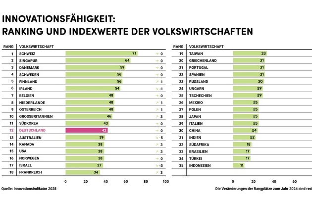 - Stagnation im Innovationsranking: Deutschland verharrt auf Rang 12, während USA, Großbritannien und Frankreich deutlich aufholen
