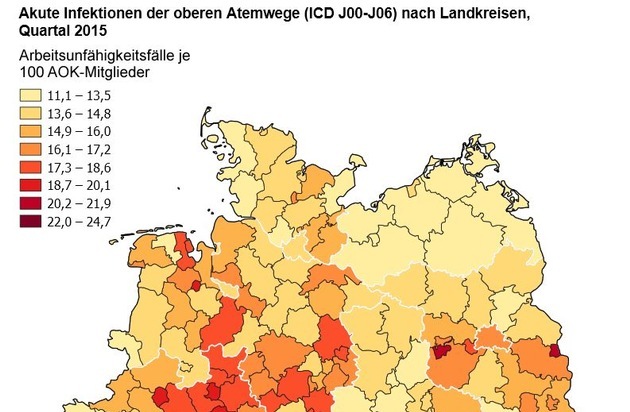 Bei den erkältungsbedingten Arbeitsunfähigkeiten zeigen sich große regionale Unterschiede. Besonders betroffen waren Regionen in Baden-Württemberg und in der westlichen Mitte Deutschlands während der Nordosten weniger betroffen war. Betrachtet man das erste Quartal 2015, waren auffallend viele Krankschreibungen aufgrund der Erkältungswelle im Ostalbkreis (24,7 Fälle je 100 Mitglieder), im Kreis Marburg-Biedenkopf und Tuttlingen (jeweils 24 Fälle je 100 Mitglieder) sowie in Koblenz und im Vogelsbergkreis (jeweils 23,5 Fälle je 100 Mitglieder) zu beobachten. In diesen Kreisen hat die Erkältungswelle 2015 besonders stark zugeschlagen; es gab mehr als doppelt so viele Fälle wie in Ludwigslust-Parchim (11,1 Fälle je 100 Mitglieder) oder Vorpommern-Rügen (11,8 Fälle je 100 Mitglieder).