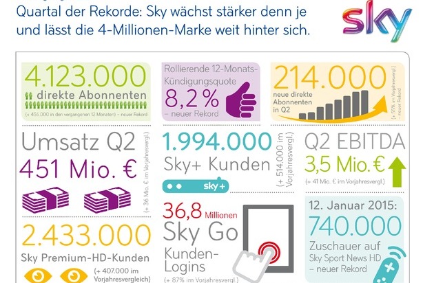 Unterföhring, 4. Februar 2015 - Im zweiten Quartal des Geschäftsjahrs 2014/15 hat Sky Deutschland neue Rekordwerte beim Kundenwachstum erzielt. Die Zahl der direkten Abonnenten stieg um 214.000 (Q2 2013/14: 138.000) und überschritt mit insgesamt 4.123.000 (Q2 2013/14: 3.667.000) erstmals die Grenze von vier Millionen. Das Bruttokundenwachstum belief sich mit 284.000 (Q2 2013/14: 244.000) ebenfalls auf Rekordniveau und belegte damit die wachsende Nachfrage nach den Services und Produkten von Sky sowie die starke Markenpräsenz. Zusammen mit der wachsenden Anzahl von Zweijahres-Verträgen, die 79% der Neuabonnements im zweiten Quartal 2014/15 ausmachten, verbesserte sich auch die Kundentreue deutlich: Die rollierende 12-Monats-Kündigungsquote lag mit 8,2% (Q2 2013/14: 11,2%) auf dem niedrigsten Niveau der Unternehmensgeschichte.