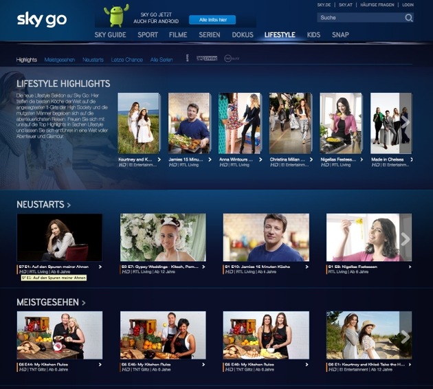 - Eigener Lifestyle-Bereich speziell für die Inhalte der Partnersender E! Entertainment, RTL Living und TNT Glitz HD auf Sky Go - Rund 100 neue Inhalte pro Monat in den Kategorien "Kochen", "Abenteuer & Reisen", "Reality" und "Modern Life" - Kommende Programmhighlights: "Keeping Up With the Kardashians" (E! Entertainment), "Knife Fight - Das härteste Kochduell der Welt" (RTL Living) und "InStyle - Das TV-Magazin" (TNT Glitz HD) 2.4.2015 - Lifestyle wird bei Sky Go jetzt großgeschrieben: Ab sofort bekommen alle Entertainment-Fans einen eigenen Lifestyle-Bereich, in dem sie jeden Monat rund 100 neue Inhalte der Sender E! Entertainment, RTL Living und TNT Glitz HD auf Abruf finden. Dort ist für jeden Geschmack etwas dabei - von Reality Shows wie "Keeping Up With The Kardashians" (E! Entertainment), über Kochsendungen wie "Knife Fight - Das härteste Kochduell der Welt" (RTL Living), Abenteuer-, Reise- und Gartensendungen bis hin zu Lifestyle- und Mode-Eigenformaten aus dem Hause Turner für TNT Glitz HD wie "InStyle - Das TV-Magazin". Sky Go steht allen Sky Kunden ab dem Sky Welt Paket kostenlos zur Verfügung, die damit auch Zugriff auf die neuen Lifestyle-Sendungen haben. Die Programme können im Web auf www.skygo.de und über die kostenlose Sky Go App auf dem iPad, iPhone, iPod touch, auf Android-Smartphones und -Tablets sowie auf der Xbox 360 flexibel abgerufen werden. Peter Schulz, Vice President On Demand Programming bei Sky Deutschland: "Mit dem Lifestyle-Bereich auf Sky Go bauen wir das umfangreiche und einzigartige Angebot unserer On-Demand-Services weiter aus. Damit bieten wir noch mehr hervorragende Programminhalte unserer Partnersender auf Abruf und bereichern abermals das Gesamterlebnis und die Flexibilität für unsere Kunden." Programmhighlights: E! Entertainment: "Keeping Up with the Kardashians" "Botched" "Christina Milian Turned Up" "Made in Chelsea" "Kourtney and Khloé Take the Hamptons" RTL Living: "Knife Fight - Das härteste Kochduell der Welt" (u.a. mit Elijah Wood, Drew Barrymore) "David Beckham - Abenteuer Amazonas" "Alan Titchmarsh - Liebe deinen Garten" "Anna Wintours Fashion Fund" "The Asgard Project - 12 Tage in der Steilwand" "Autana - Expedition auf den heiligen Berg" TNT Glitz HD: "Donna Hay: Fast, Fresh, Simple" "InStyle - Das TV-Magazin" "My Kitchen Rules" "The Outdoor Room with Jamie Durie" "No Ruhmservice" "Mein Leben auf dem Land" Über Sky Deutschland: Mit über 4,1 Mio. Kunden und einem Jahresumsatz von rund 1,7 Mrd. Euro ist Sky in Deutschland und Österreich Pay-TV-Marktführer. Das Programmangebot besteht aus Live-Sport, Spielfilmen, Serien, Kinderprogrammen und Dokumentationen. Sky Deutschland beschäftigt rund 2.500 Mitarbeiter und hat seinen Hauptsitz in Unterföhring bei München. Das Unternehmen ist Teil von Europas führender Unterhaltungsgruppe Sky plc (Stand: 31.12.2014).