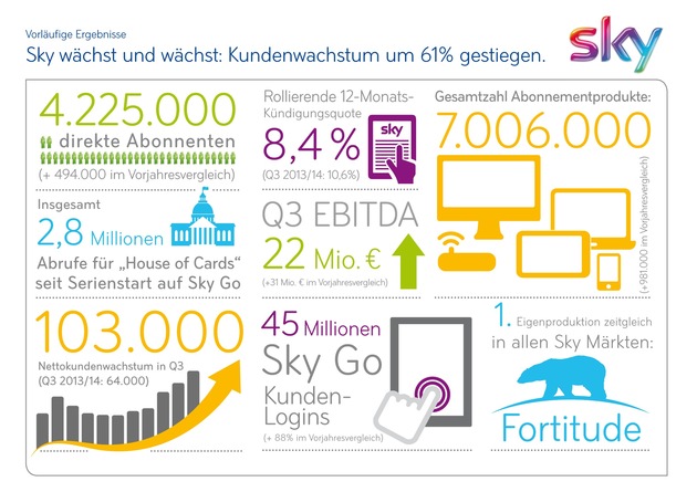 Holdings GmbHBrian Sullivan, Vorsitzender des Vorstands der Sky Deutschland AG: "Die konsequente Kundenorientierung von Sky hat wieder zu einem Rekord-Wachstum und zu herausragend guten Ergebnissen geführt. Unsere einfache Formel erweist sich als wirkungsvoller denn je: Großartige und exklusive Inhalte, die die Leute sehen wollen, innovative Produkte, die unsere Programme überall und zu jeder Zeit zugänglich machen, und ausgezeichneter Kundenservice, dessen Mitarbeiter sich bestmöglich für die Bedürfnisse unserer Kunden einsetzen. Mit nahezu einer halben Million neuer Kunden in den letzten 12 Monaten entwickelt sich Sky zu einem Muss für alle, die großartiges Entertainment lieben - und das Potenzial wächst stetig weiter. Mit Carsten Schmidt, der die Leitung hier in Deutschland und Österreich übernimmt und eng mit Jeremy Darroch und unseren Kollegen in der Sky Gruppe zusammenarbeitet, beginnt der nächste Schritt in der Entwicklung des zweifellos besten Unterhaltungsunternehmens in Europa. Ich bin unglaublich stolz auf das, was unser Team erreicht hat - und wir stehen erst am Anfang. Nie zuvor war es lohnenswerter, Kunde von Sky zu sein."
