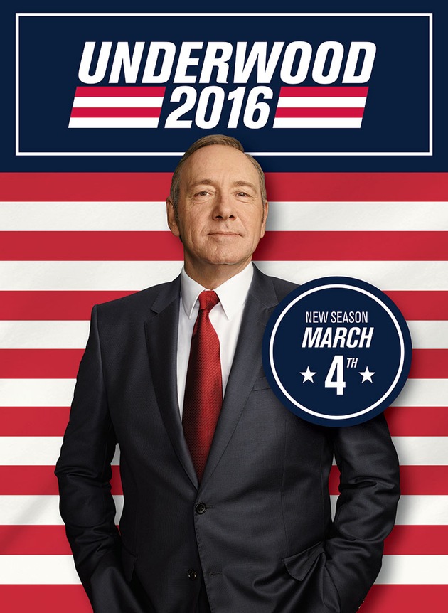 Originaltitel: "House of Cards", Dramaserie, USA 2015, 13 Episoden à ca. 60 Min. Regie: u.a. James Foley, Robin Wright, John Dahl. Drehbuch: Beau Willimon. Darsteller: Kevin Spacey, Robin Wright, Michael Kelly, Neve Campbell.