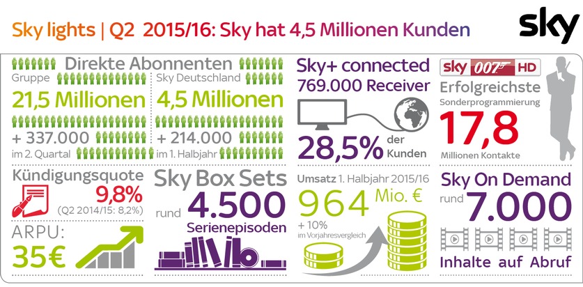 Unterföhring, 29. Januar 2016 - Im 1. Halbjahr des Geschäftsjahres 2015/16 sind Umsatz und Abonnentenzahl von Sky Deutschland erneut deutlich gestiegen. Der Umsatz legte mit 964 Millionen Euro um 10 Prozent gegenüber dem Vorjahr zu. Das Netto-Neukundenwachstum belief sich im 1. Halbjahr auf 214.000. Sky hat damit in Deutschland und Österreich nun rund 4,5 Millionen Kunden und trägt erheblich zum gesamten Kundenwachstum des Mutterkonzerns Sky plc mit derzeit 21,5 Millionen Abonnenten in allen fünf Märkten bei. Eine steigende Nachfrage ist auch bei den Programmen und Produkten von Sky zu verzeichnen: Das Gesamtwachstum aller bezahlten Abonnementprodukte lag im 1. Halbjahr bei 581.000 und beträgt nun 7,7 Millionen. Der durchschnittliche Umsatz pro Privatkunde (ARPU) ist auf 35 Euro gestiegen.