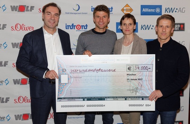 Thomas Müller, FC-Bayern-Profi und Botschafter der Onlineberatungsstelle "YoungWings" nahm den Spendenscheck gemeinsam mit den Stiftungsvorständen Martina Münch-Nicolaidis, Nicolaidis YoungWings Stiftung, und Prof. Wolfram Winter, Sky Stiftung, entgegen. "Herz war heute Trumpf. Ein großartiger Abend mit einer herausragenden Spendensumme. Beide Stiftungen können damit in der Kinder- und Jugendarbeit viel bewegen. Besonders habe ich mich über die breite Unterstützung von Freunden und Spielern aus unterschiedlichen Vereinen und Sportarten gefreut.", so Thomas Müller nach dem hart umkämpften Turnier.