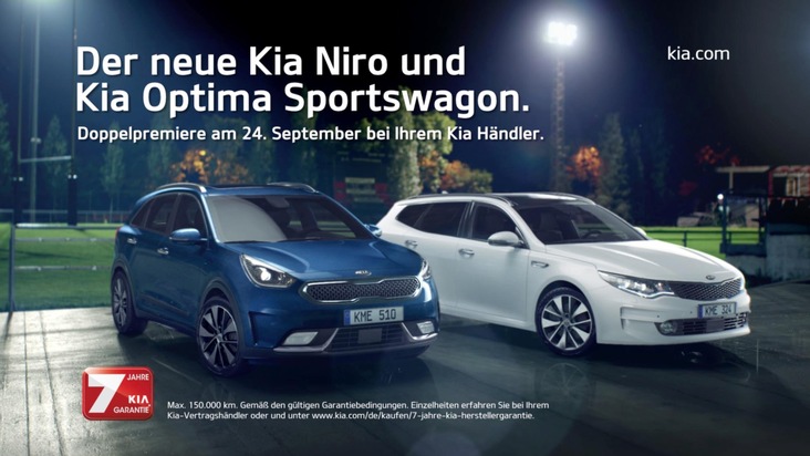 Kia feiert am kommenden Wochenende eine doppelte Marktpremiere und debütiert damit zugleich in zwei Fahrzeugsegmenten. Mit dem Kia Niro bietet die Marke ein neues Crossover-Hybridmodell mit markanter Kompakt-SUV-Form und hocheffizientem Antrieb an (ab 88 g/km CO2). Und in der Mittelklasse geht mit dem Kia Optima Sportswagon erstmals ein Kia-Kombi an den Start. Zudem führt die Marke hier mit der 180 kW (245 PS) starken GT-Version, die für beide Karosserievarianten des Kia Optima* erhältlich ist, ihr bisher kraftvollstes und schnellstes Modell in Europa ein. Komplettiert wird die Modellfamilie durch den ebenfalls neuen Kia Optima Plug-in Hybrid*. Die Hybrid-Limousine mit Steckdosenanschluss kommt wie alle genannten Modelle am 24. September in den Handel.