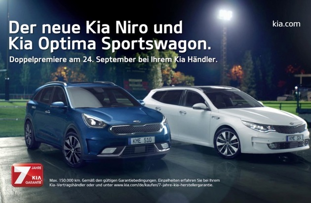 Kia feiert am kommenden Wochenende eine doppelte Marktpremiere und debütiert damit zugleich in zwei Fahrzeugsegmenten. Mit dem Kia Niro bietet die Marke ein neues Crossover-Hybridmodell mit markanter Kompakt-SUV-Form und hocheffizientem Antrieb an (ab 88 g/km CO2). Und in der Mittelklasse geht mit dem Kia Optima Sportswagon erstmals ein Kia-Kombi an den Start. Zudem führt die Marke hier mit der 180 kW (245 PS) starken GT-Version, die für beide Karosserievarianten des Kia Optima* erhältlich ist, ihr bisher kraftvollstes und schnellstes Modell in Europa ein. Komplettiert wird die Modellfamilie durch den ebenfalls neuen Kia Optima Plug-in Hybrid*. Die Hybrid-Limousine mit Steckdosenanschluss kommt wie alle genannten Modelle am 24. September in den Handel.