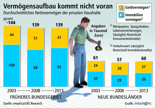 Den Auswertungen zufolge besitzt der durchschnittliche Haushalt im früheren Bundesgebiet ein Gesamtvermögen von 170.000 Euro. Abzüglich der Schulden in Höhe von im Schnitt 31.000 Euro (überwiegend Immobilienkredite) verbleibt ein Nettovermögen von durchschnittlich 139.000 Euro, exakt so viel wie im Jahr 2008 und 5.000 Euro weniger als vor zehn Jahren, so LBS Research. In den neuen Ländern liegt das Nettovermögen mit im Schnitt 60.000 Euro um mehr als die Hälfte niedriger als im Westen. Auch im Osten sind die Menschen in den zurückliegenden zehn Jahren nicht reicher geworden. Vor zehn Jahren betrug das Durchschnittsvermögen hier 61.000 Euro (vgl. Grafik).