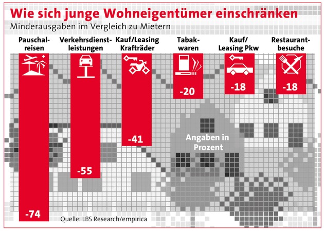 Frisch gebackene Wohneigentümer müssen sich in der Regel finanziell nach der Decke strecken. Die anfänglichen Belastungen aus Zins- und Tilgungsleistungen zwingen sie zum Konsumverzicht. Doch in welchen Bereichen und in welchem Ausmaß schränken sich junge Bauherren und Käufer im Vergleich zu Mieterhaushalten eigentlich ein? Dieser Frage ist das Forschungsinstitut empirica in Zusammenarbeit mit LBS Research nachgegangen. Die Wissenschaftler haben auf Basis der aktuellen Einkommens- und Verbrauchsstichprobe (EVS)* des Statistischen Bundesamtes über 200 Einzelposten aus 12 Konsumkategorien ausgewertet. Betrachtet wurden 30- bis unter 45-jährige Mieter- und Eigentümerhaushalte mit einem Monatseinkommen zwischen 2.000 bis 3.000 Euro netto.