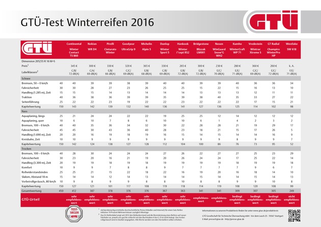 Als Testsieger geht der brandneue Continental WinterContact TS 860 mit der GTÜ-Bestnote "sehr empfehlenswert" durchs Ziel - mit extrem gutem Gripp sowie sehr hohen Sicherheitsreserven auf Schnee und regennasser Fahrbahn. Auch bei trockenen Straßenverhältnissen fährt der Conti ganz vorne mit, nicht zuletzt dank des niedrigsten Rollwiderstands aller getesteten Reifen.