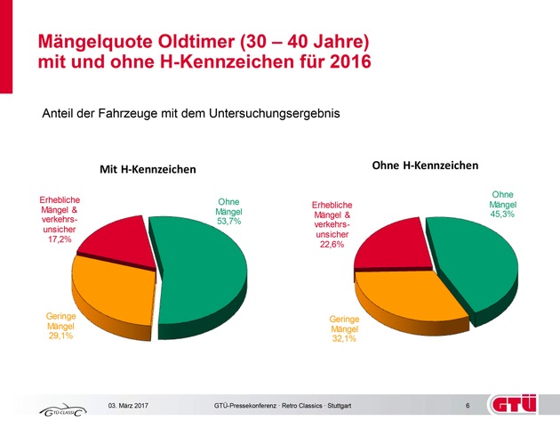 "Diese Entwicklung zeigt deutlich, dass die Besitzer von Oldtimern mit H-Kennzeichen ihren Fahrzeugen durchaus das zum Erhalt erforderliche Maß an Pflege und Wartung zukommen lassen. Ganz im Gegensatz zu den Haltern vieler im Alltag genutzter Autos" so Klaus Reiting, stellvertretender Technischer Leiter der GTÜ.
