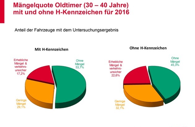 Mehr als die Hälfte (53,7 Prozent) der Pkw mit H-Kennzeichen im Alter von 30 bis 40 Jahren erhalten bei der fälligen Hauptuntersuchung (HU) die neue Prüfplakette bereits im ersten Anlauf. Zum Vergleich: Bei Fahrzeugen im Alter von 20 bis 30 Jahren - den Youngtimern - fällt jedes Dritte (33,3 Prozent) bei der HU durch. Mit geringen Mängeln sind 29,1 der Klassiker unterwegs (Youngtimer 30,8 Prozent), der Anteil der erheblichen Mängel liegt bei den Oldtimern bei 17,2 Prozent (Youngtimer: 33,1 Prozent).