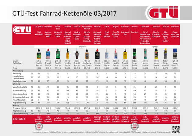 Testsieger bei den Tropfölen wurde mit dem Prädikat "sehr empfehlenswert" das F100 Kettenöl von Dr. Wack, gefolgt vom ebenfalls sehr empfehlenswerten Dynamic Kettenschmierstoff, der in der Kategorie Tropföle zusätzlich als Preis-Leistungssieger ausgezeichnet wurde. Als empfehlenswert stuften die GTÜ-Experten die punktgleichen Finish Line Kettenöl synthetisch und Rohloff Spezial Kettenschmierstoff ein sowie dahinter Muc-Off Hydro Dynamic Chain Lube und Woodman's finest Bicycle Care Mango-Syrup Chainlube. Mango-Syrup? Das Woodman's riecht tatsächlich Mango-fruchtig und kommt als einziges der getesteten Produkte in einer Glasflasche mit Pipette daher. Bedingt empfehlenswert schnitten Oelzeuch High End Kettenfluid von Atlantic ab sowie das Profi Line Bikeröl von Ernst, Nigrin Fein-Öl für Fahrräder und Hanseline Schmieröl Bio.