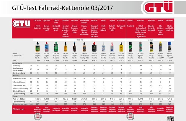 Testsieger bei den Tropfölen wurde mit dem Prädikat "sehr empfehlenswert" das F100 Kettenöl von Dr. Wack, gefolgt vom ebenfalls sehr empfehlenswerten Dynamic Kettenschmierstoff, der in der Kategorie Tropföle zusätzlich als Preis-Leistungssieger ausgezeichnet wurde. Als empfehlenswert stuften die GTÜ-Experten die punktgleichen Finish Line Kettenöl synthetisch und Rohloff Spezial Kettenschmierstoff ein sowie dahinter Muc-Off Hydro Dynamic Chain Lube und Woodman's finest Bicycle Care Mango-Syrup Chainlube. Mango-Syrup? Das Woodman's riecht tatsächlich Mango-fruchtig und kommt als einziges der getesteten Produkte in einer Glasflasche mit Pipette daher. Bedingt empfehlenswert schnitten Oelzeuch High End Kettenfluid von Atlantic ab sowie das Profi Line Bikeröl von Ernst, Nigrin Fein-Öl für Fahrräder und Hanseline Schmieröl Bio.